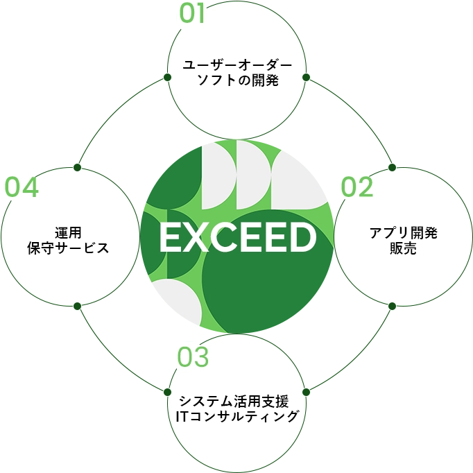 Driven by Technology, Built on Trust. About Us 私たちについて 人の幸せを起点に、ソフトウェアを進化させる。 エクシードのお客様企業は、エンドユーザーの満足を徹底的に追求したり、煩雑な業務を効率化し、従業員のウェルビーイング向上を大切にしている企業です。既存のソフトウェア製品やソリューションだけでは解決できない課題に直面することも多いため、私たちは常に真剣にアイデアを練り、お客様の想いを形にしてきました。時には前例のない挑戦に踏み出すこともあります。しかし、そのプロセスには必ず「働く喜び」と「創る楽しさ」があります。「お客様の満足とウェルビーイングに貢献するためには、まず私たち自身がハッピーであること」。この考え方を体現しながら、エクシードはお客様と共に未来を拓いていきます。 read more Services サービス 現場の課題に寄り添うオーダーメード開発を支援します。 多くの企業が、既存のパッケージシステムで「現場で使いにくい」「大規模なカスタマイズが必要」「コストや工数が膨らむ」といった課題に直面しています。エクシードは、こうした声に向き合い、お客様固有の課題や現場のニーズに寄り添ったソリューションを提供。単にシステムを導入するのではなく、事業に最適なオーダーメード開発を通じて、業務効率化や事業成長を支援します。 read more 01 Custom software development ユーザーオーダーソフトの開発 お客様の現場に寄り添い、求められる機能を確実に形にするソフトウェア開発。 Webアプリケーションを軸に、先進技術を取り入れながら、 幅広い業界での構築実績を着実に増やしています。 02 App development and sales アプリ開発・販売 スマートフォンやタブレット向けのアプリをはじめ、クラウドサービスと連携する自社ブランドのアプリケーションで、お客様の利便性向上をサポートしています。 03 System support and IT consulting システム活用支援 / ITコンサルティング アプリやWebサービスの導入、IT基盤の刷新、従業員の創造力向上、データドリブン型の意思決定など、お客様の経営戦略やIT投資計画に寄り添ったコンサルティングと、情報システムの活用支援を提供しています。 04 Operation and maintenance services 運用・保守サービス お客様のシステムやクラウド環境の運用・保守をトータルにサポートします。日々の運用やトラブル対応でお悩みの際は、ぜひエクシードにご相談ください。 News お知らせ 2025.12.01 コーポレートサイトをリニューアルしました。 2025.12.01 リクルートサイトを公開しました。 2025.01.10 新卒採用情報2026年3月 大学・専門学校等卒業予定者向け募集要項を公開しました。 2024.06.26 プライバシーマークの更新認定を受けました。 株式会社エクシードは2024年6月26日付けで一般財団法人日本情報経済社会推進協会(JIPDEC)より、個人情報の適切な取り扱いをおこなう事業者に付与される『プライバシーマーク』の更新認定を受けました。 Join Us to Shape the Future Together. 採用情報 Recruit エクシードでは、一緒に働く仲間を募集しています。エンジニアにご興味のある方は、ぜひご覧ください! recruit site